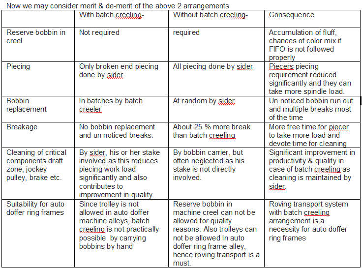 1)By batch creeling arrangement practical breakage rate can be brought down by about 25%,for example 40 breaks /1000 spindles per hour can be brought down to 30 breaks /1000 spindles per hour as there is no unnoticed run out of bobbins hence no breaks/multiple breaks.